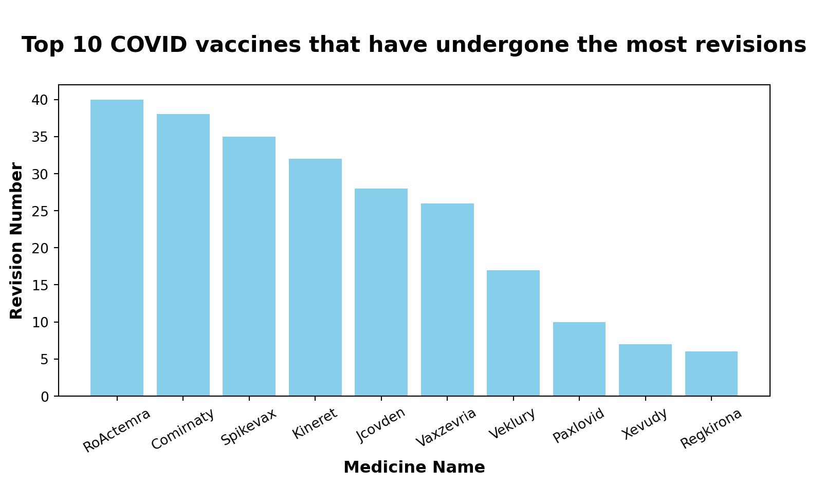 3. Sorted the dataset based on the ‘revision_number’ in descending order to get the vaccines with the most revisions.