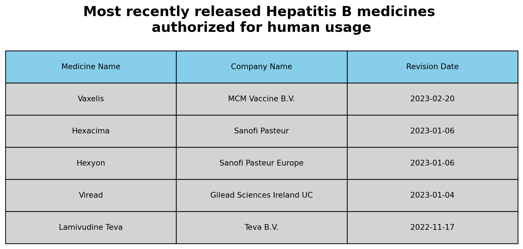 What are the most recently released medicines (name and company) authorized for human usage for ‘Hepatitis B’?