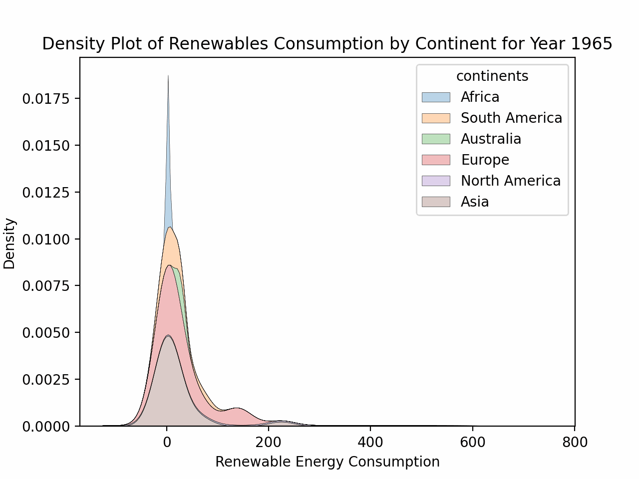 Africa has a very steep density curve implying that its consumption of renewable energy has barely grown over the years.
